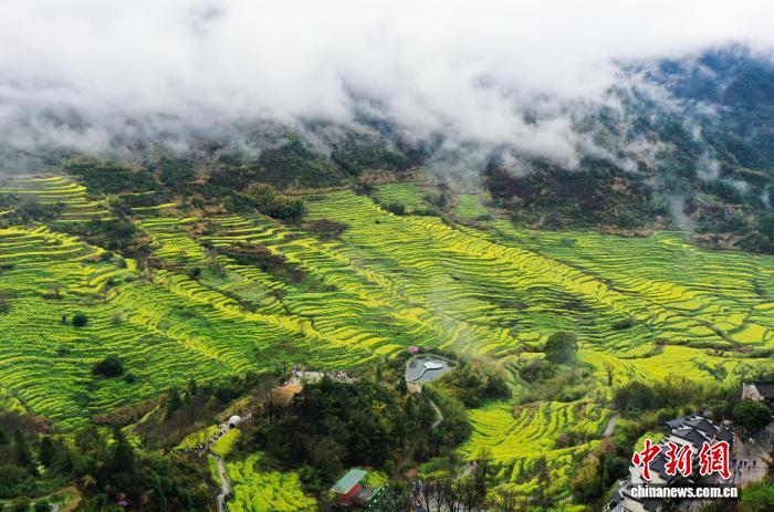 3月24日,位于“华夏最好村落”江西婺源县的篁岭万亩梯田油菜花竞相开放,金色花海层层叠叠,正在云雾旋绕停绝隐诗情绘意。(无人机相片)中新社记者 刘占昆 摄